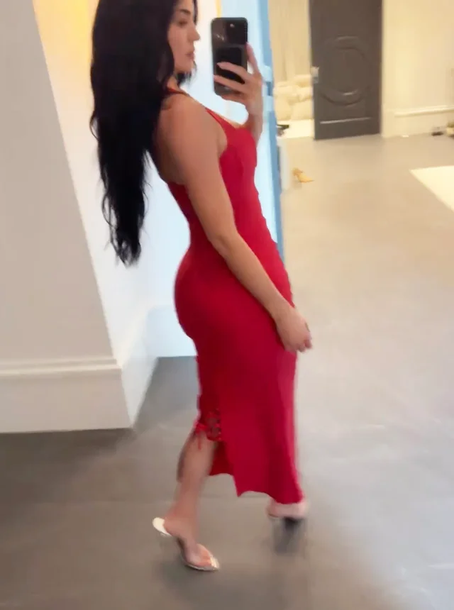 A second mirror selfie showcased the dress’ low-cut neckline as Jenner posed with her dark hair styled in loose waves.